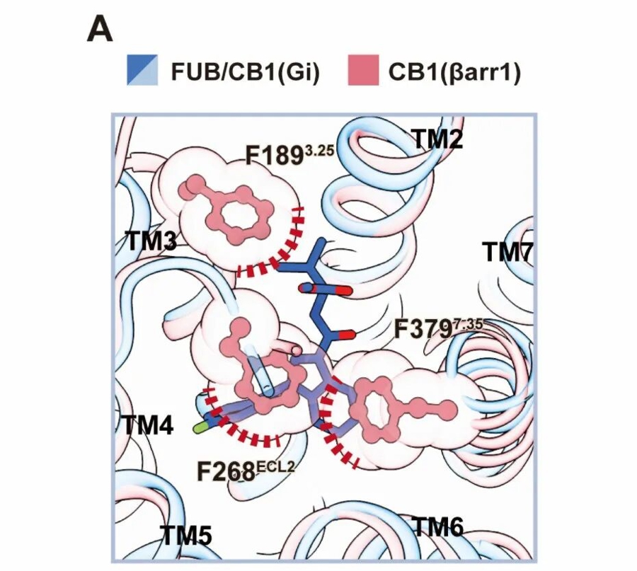 考虑发现,当CB1与β-arrestin偶联时,受体勾搭口袋内三个芳醇氨基酸残基与传统大麻类兴隆剂产生彰着空间位阻,因而必须选择“深埋构象”,导致了反作用的发生。基于此,团队针对传统兴隆剂参与空间位阻的基团进行了感性规画:引入两种不同基团取得新式小分子,从而调动配体与受体勾搭情势,使其无法插足阿谁通往反作用的“深埋口袋”。